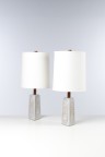 Paire de lampes de table Céramique, noyer, laiton et textile Édition Marshall Studios Signées 'Martz' sur les bases Modèle créé dans les années 1960 H 76 × Ø 34cm