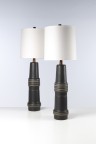 Paire de lampes de table Céramique, noyer, laiton et textile Édition Marshall Studios Signées 'Martz' sur les bases Modèle créé dans les années 1960 H 120 × Ø 42cm