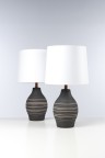 Paire de lampes de table Céramique, noyer, laiton et textile Édition Marshall Studios Signées 'Martz' sur les bases Modèle créé dans les années 1960 H 78 × Ø 43cm