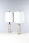 Paire de lampes de table Céramique, noyer, laiton et textile Édition Marshall Studios Signées 'Martz' sur les bases Modèle créé dans les années 1960 H 84 × Ø 38,5cm