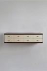 Sapelli, bois peint, verre teinté et laiton