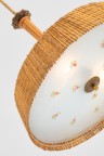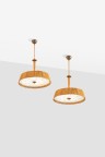 Paire de plafonniers Laiton, lamelles de bois et verre Édition Idman Modèle créé vers 1950 H 75ר 46cm