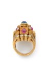 Bague dôme d'inspiration byzantine en or jaune 18k (750‰) à motif cruciforme serti de quatre rubis et d'un saphir cabochon et de diamants ronds Travail probablement grec, gravée 750 22k Tdd : 56,5 Poids brut : 23,6 g